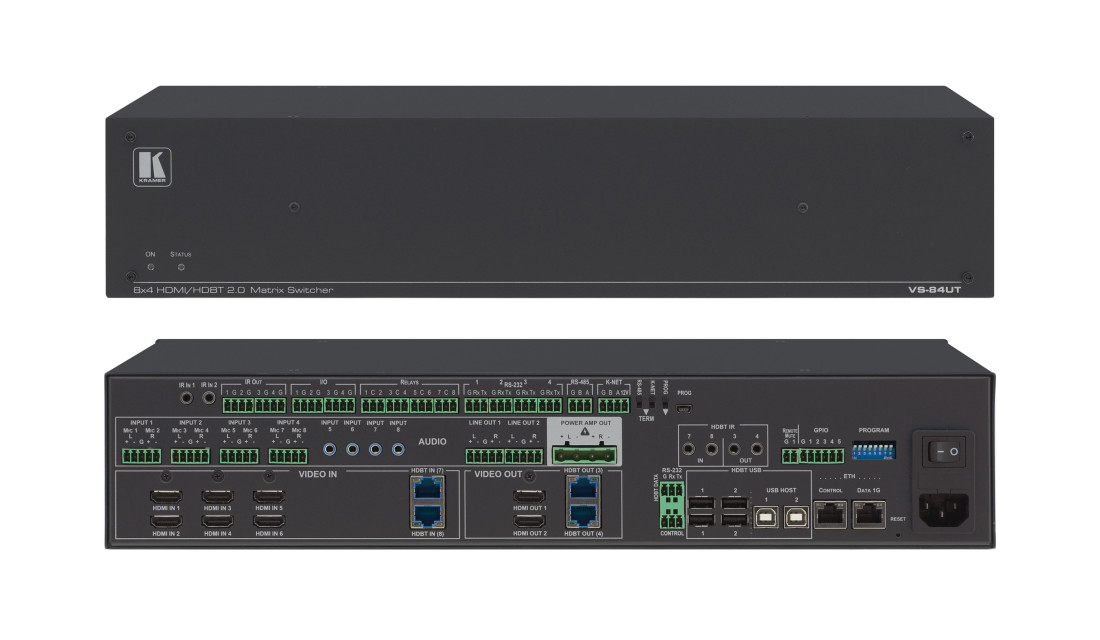 KRAMER AiO Pres.System: 8x4 4K60 HDMI/HDBaseT 2.0 Matrix Switch, Master Room Ctrl, PoE, Power Ampl.